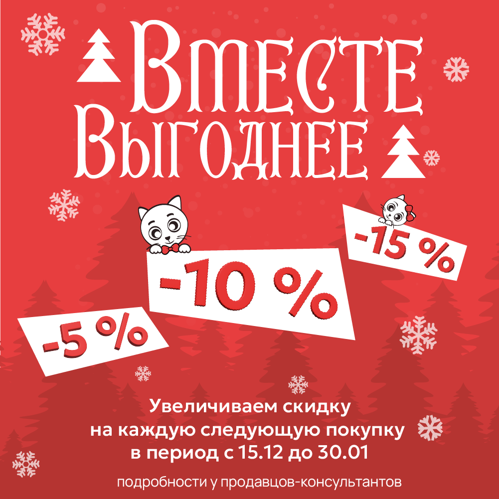 Часто наши покупатели предпочитают заказывать сразу всю мебель в нашем салоне. Для таких клиентов мы усиливаем лояльность и даем возможность сэкономить! Скидка на все покупки: 5% — на первую, 10% — на вторую, 15% — на третью и последующую.